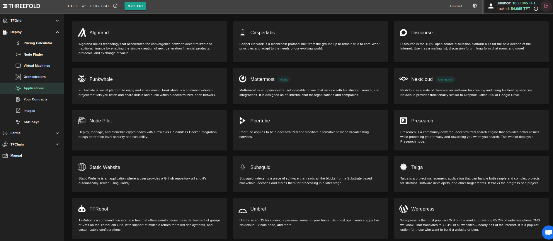 DocumentationThreeFold DashboardDeployLabsLabsEasily deploy your favourite applications on the ThreeFold grid with a click of a button. TABLE OF CONTENTS Algorand CasperLabs Discourse Funkwhale Gitea Jenkins Jitsi Mattermost Nextcloud Node Pilot Nostr Open WebUI Peertube Presearch Static Website Subsquid Taiga TFRobot Umbrel WordPress