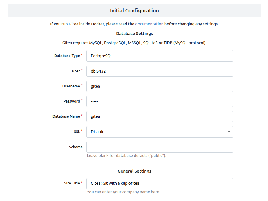 Once you've accessed the Gitea instance, you can adjust the Initial Configuration if needed.