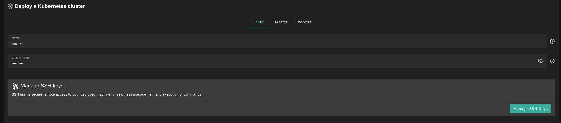 Name: Your Kubernetes Cluster name.Cluster Token: It's used for authentication between your worker nodes and master node. You could use the auto-generated one or type your own.