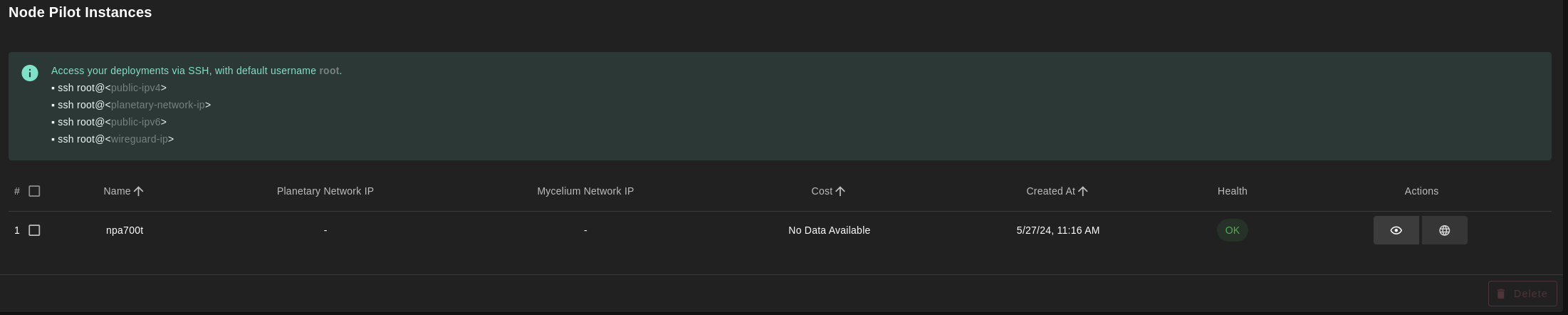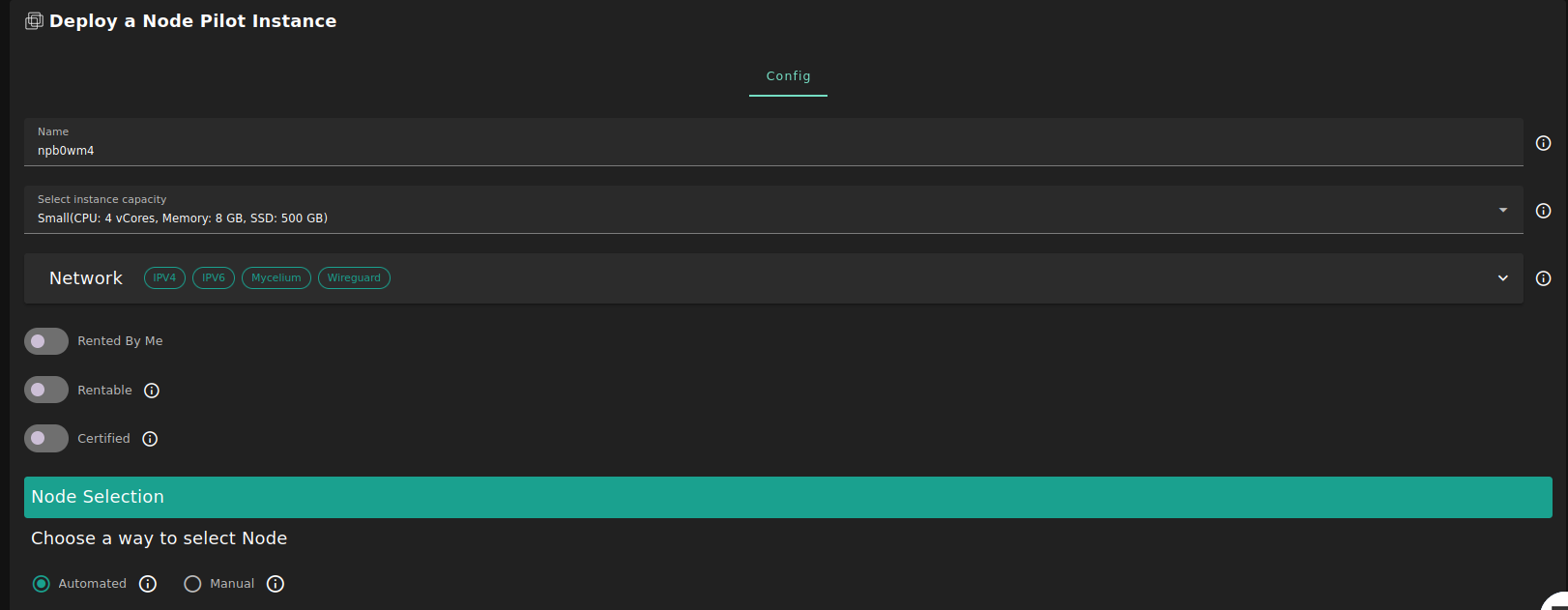 • When using the flist you get a node pilot instance ready out-of-box. You need to get a public IPv4 to get it to works.