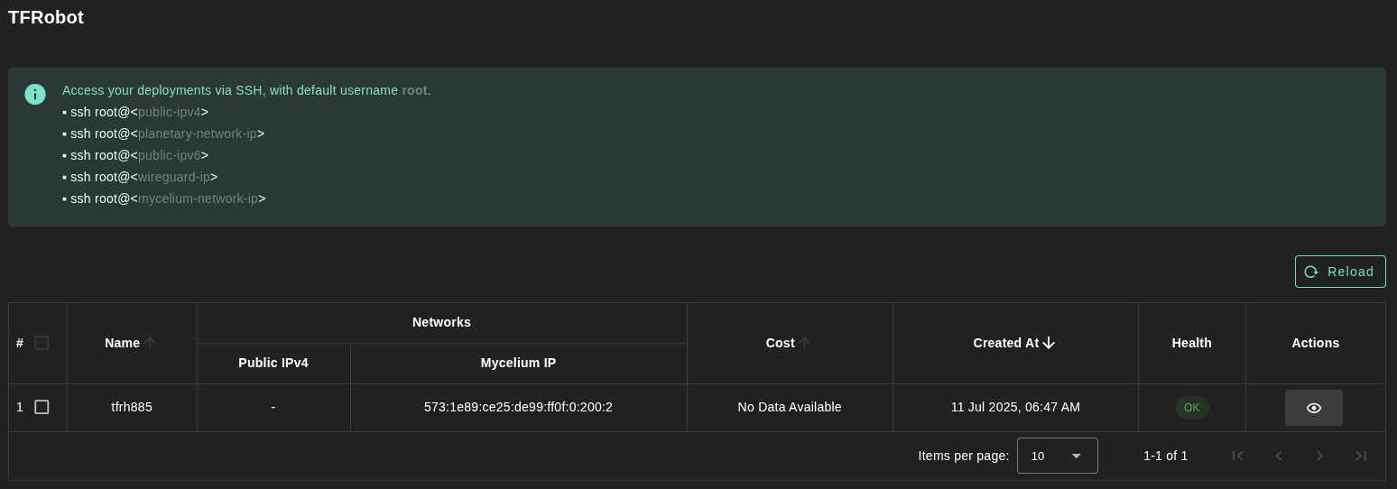 TFROBOT (tfrobot) is a command line interface tool that offers simultaneous mass deployment of groups of VMs on the ThreeFold Grid, with support of multiple retries for failed deployments, and customizable configurations, where you can define node groups, VMs groups and other configurations through a YAML or a JSON file.
