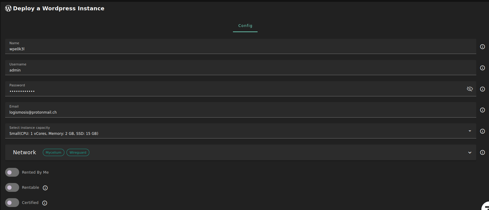 A domain name is required to use WordPress. You can either use your own, which we'll call a custom domain, or you can get a free subdomain from a gateway node. Note that this won't impact the function of your deployment, it's just a matter of preference. If you want to use your own domain, follow the steps for custom domain wherever you see them below.