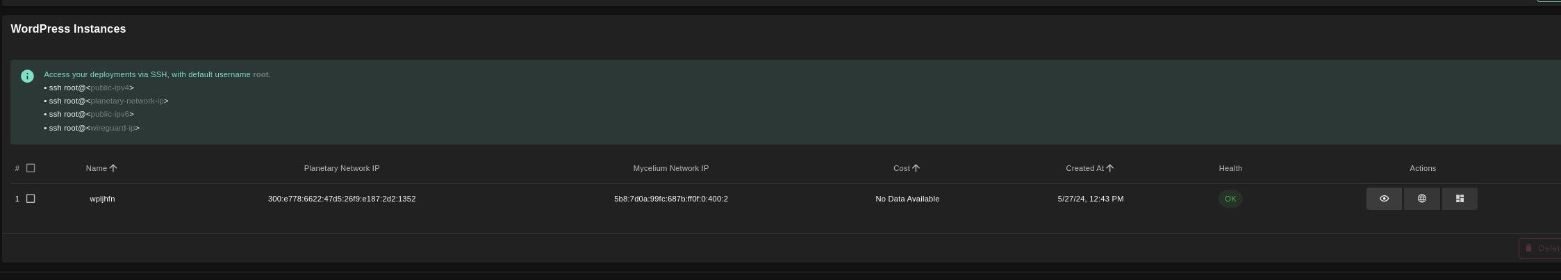 In the section WordPress Instances, you can see a list of all of your deployed instances: