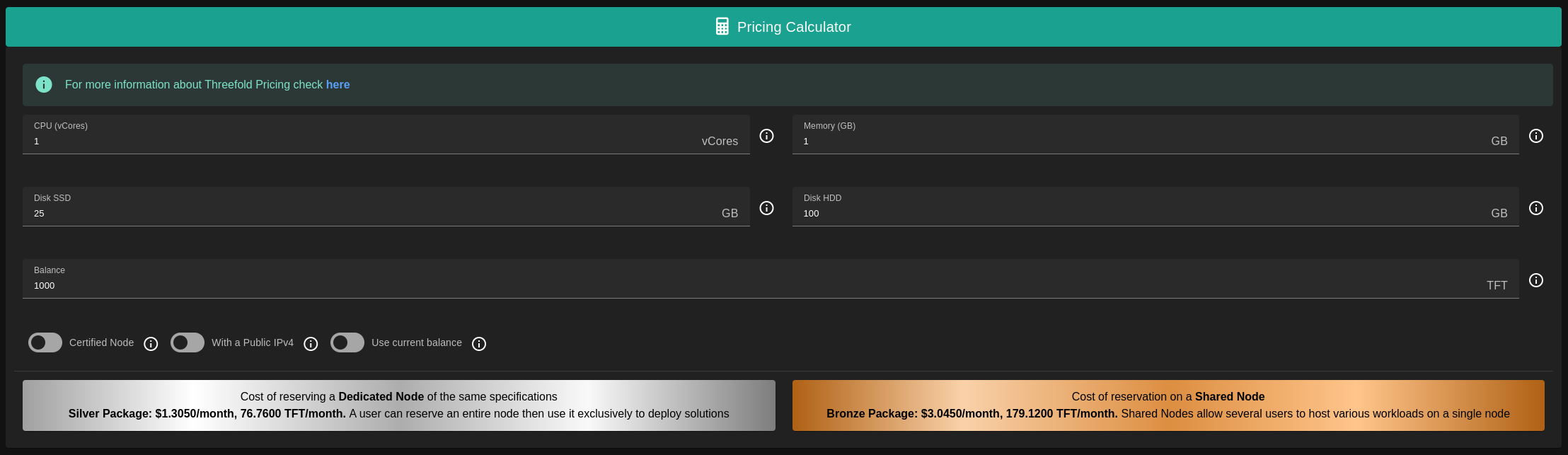 A tool provided by ThreeFold that allows users to estimate and calculate potential cost of a deployment on the ThreeFold grid. The resource calculator takes into account various factors, including deployment resources, node certification, currnet balance, and in return it displays an accurate estimate for the deployment in terms of ThreeFold Tokens (TFT) and in USD per month.