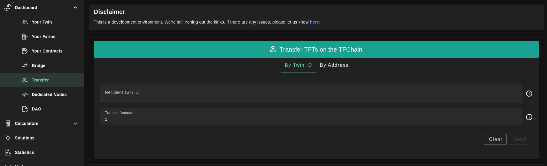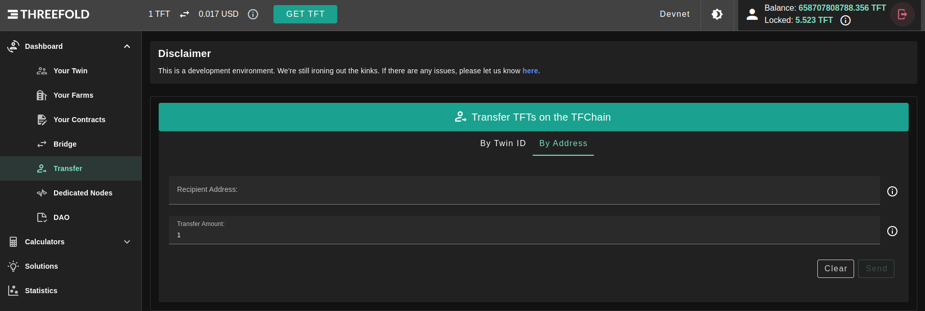 You can transfer TFTs by recipient address or recipient twin id; by selecting the needed tab.