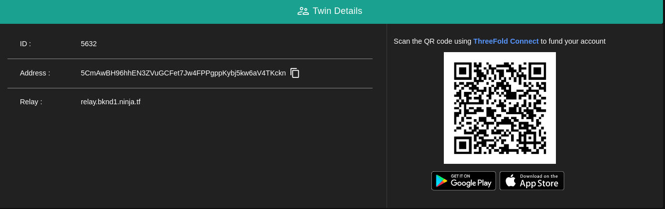 IDYour unique identifier for your twin on the ThreeFold chain.AddressYour public address on the ThreeFold chain.RelayA relay is a component that facilitates the reliable and secure transfer of messages between different entities within the ThreeFold ecosystem.
