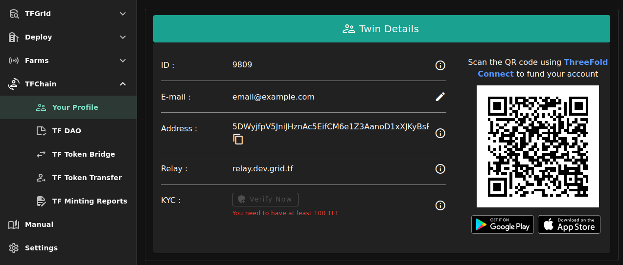 Your Profileof theTFChainsection of the Dashboard - Make sure that you have at least 100 TFT in the wallet