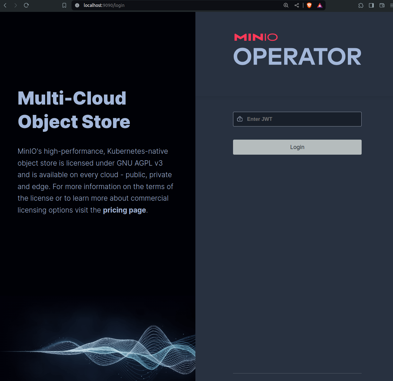 To log in the MinIO Operator, you will need to enter the token. To see the token, run the following line: