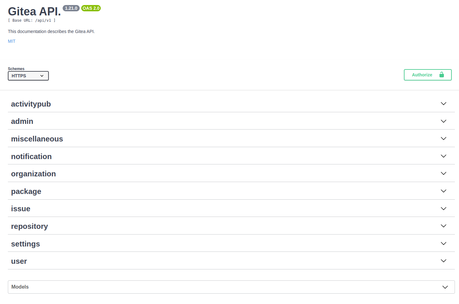 The Gitea API is available with the slugs /api/swagger# after your Gitea domain URL.