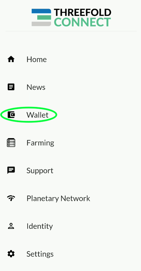 To find your Stellar address and secret key, go on the TF Connect app and select the Wallet section: