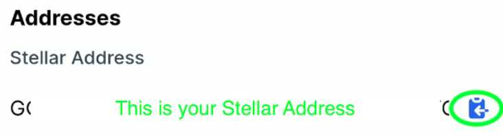 At the top of the section, click on the copy button to copy your Stellar Address: