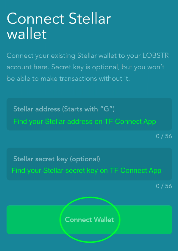 As you can see on this next picture, you need the Stellar address and secret key to properly connect your TF Connect app wallet to Lobstr: