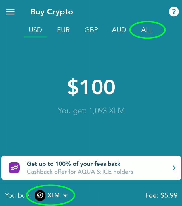 By default, the crypto selected is XLM. This is alright for us as we will quickly swap the XLM for TFT.