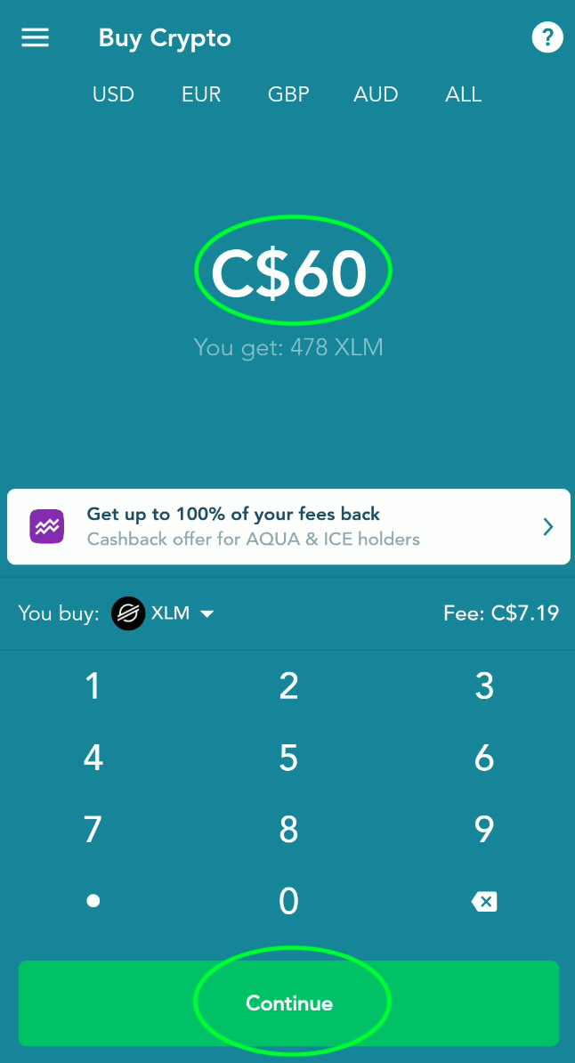 You will then need to decide how much XLM you want to buy. Note that there can be a minimum amount. Once you chose the desired amount, click on Continue.
