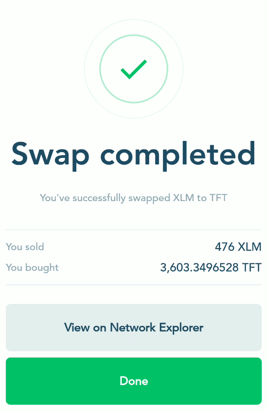 Within a few seconds, you will receive a confirmation that your swap is completed: Note that the TFT is directly sent on your TF Connect app wallet.