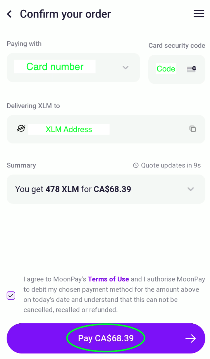 Once you've set up your Moonpay payment method, you will need to process and confirm the transaction: