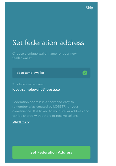 (Optional) Set a federation address, which is the unique name of your new Stellar wallet that can be shared with others to receive funds and click 'Save'.