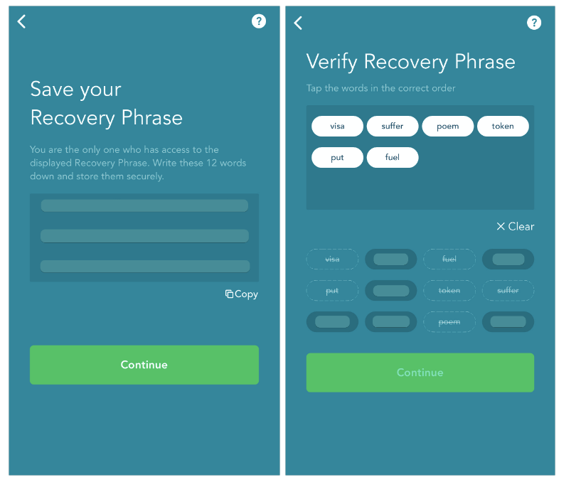 Write down your Recovery Phrase, which is needed to recover access to your account in case of a password loss or if your phone is lost or stolen. The word order is very important.