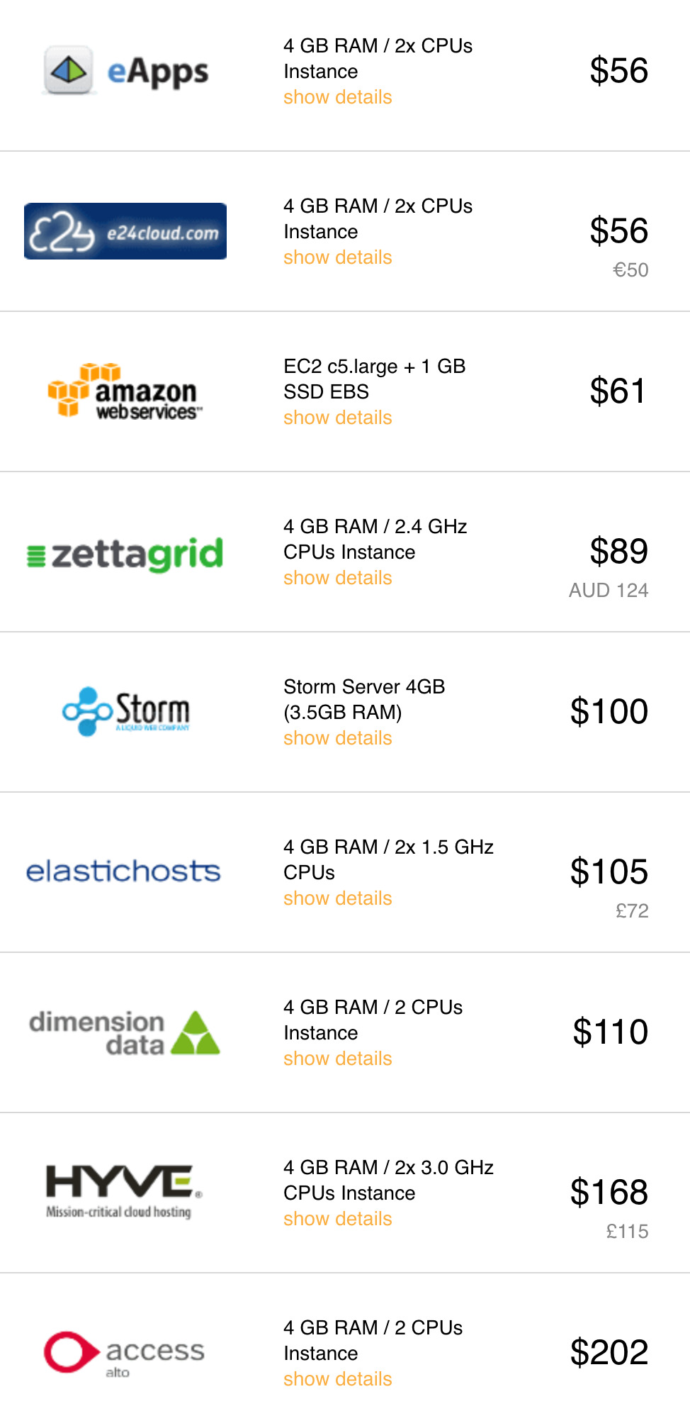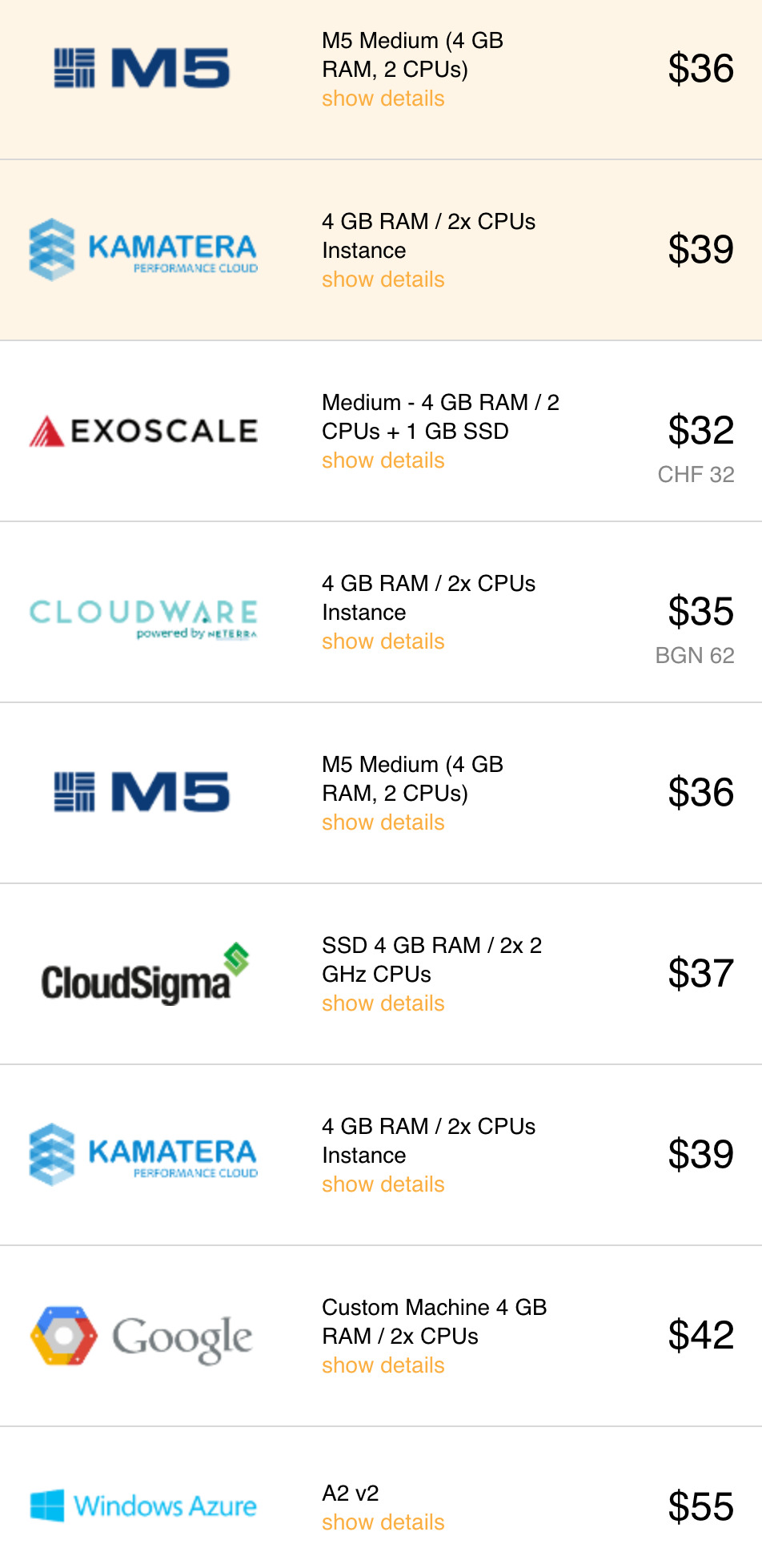 We compare cloud pricing with Cloudorado. Note that the information here can be subject to change and might not reflect current market prices.