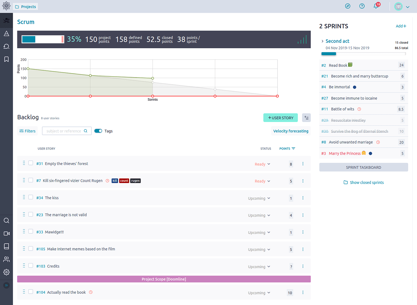 There are various so called artifacts in Scrum. The top three are the Backlog, the User Stories and the Sprints. They respectively represent what is to be done ordered by priority and readyness, the pieces of work themselves and the fixed time periods in which we put selected User Stories to be worked upon and finished.