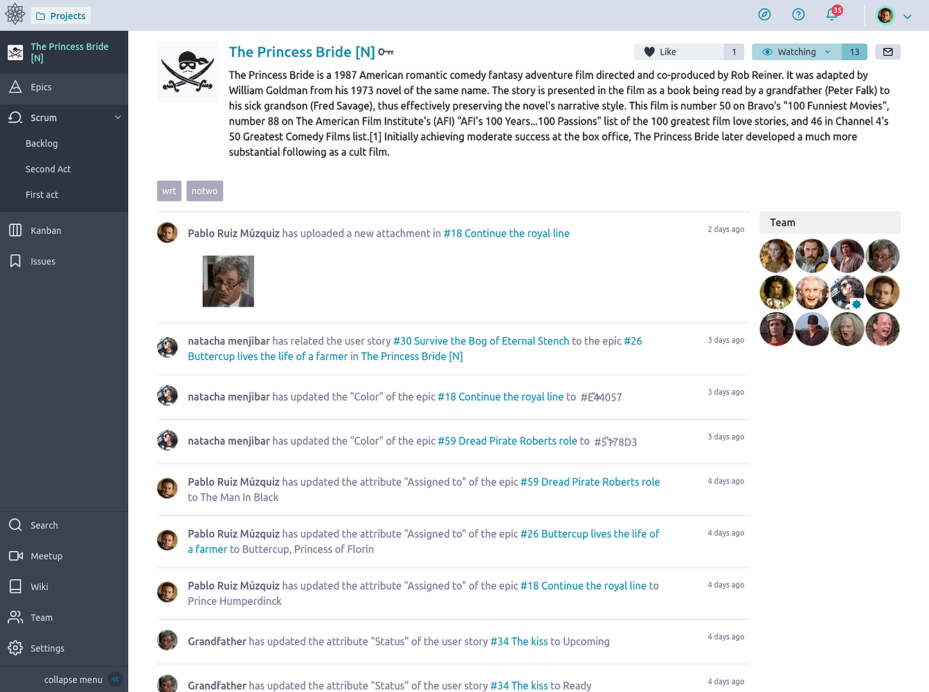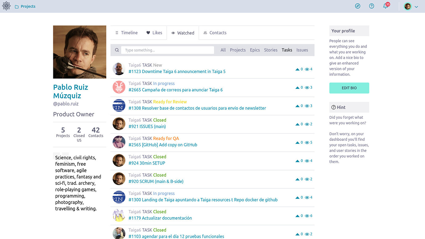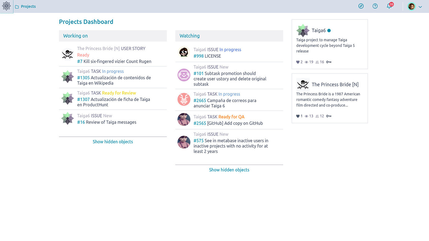 Upon login or if you just go to your Circle Tool, you’re confronted with your dashboard with quick access to your working on items, a list of watched items and shortcuts to your projects. You can always go back to your dashboard by clicking on the Taiga icon on the top bar.