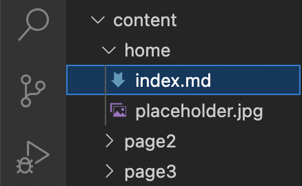 based on the navbar picture above, it means that I have created 3 separate content subfolders, each with an index.md file on it called Home, ThreeFoldFeed and GetServer.