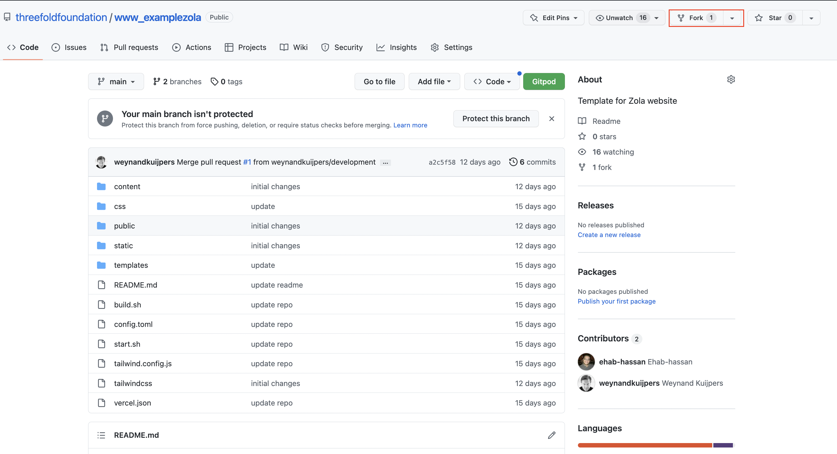 Our Team has especially created an html/css/markdown based template repository on github, free for anyone to use. To start working on your project, simply fork this repository to your own github account by clicking the 'fork' account on the repository, and rename it with your website's name.
