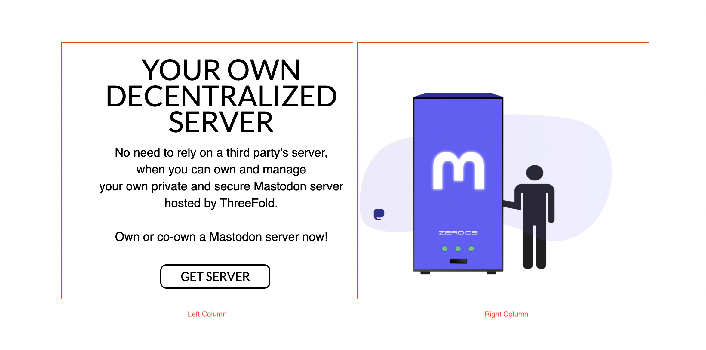 For more than one column section, we need to configure the row and column syntax. For example: Sometimes you would like to have a page where you place your texts and buttons on left column and an image on the right column, like: