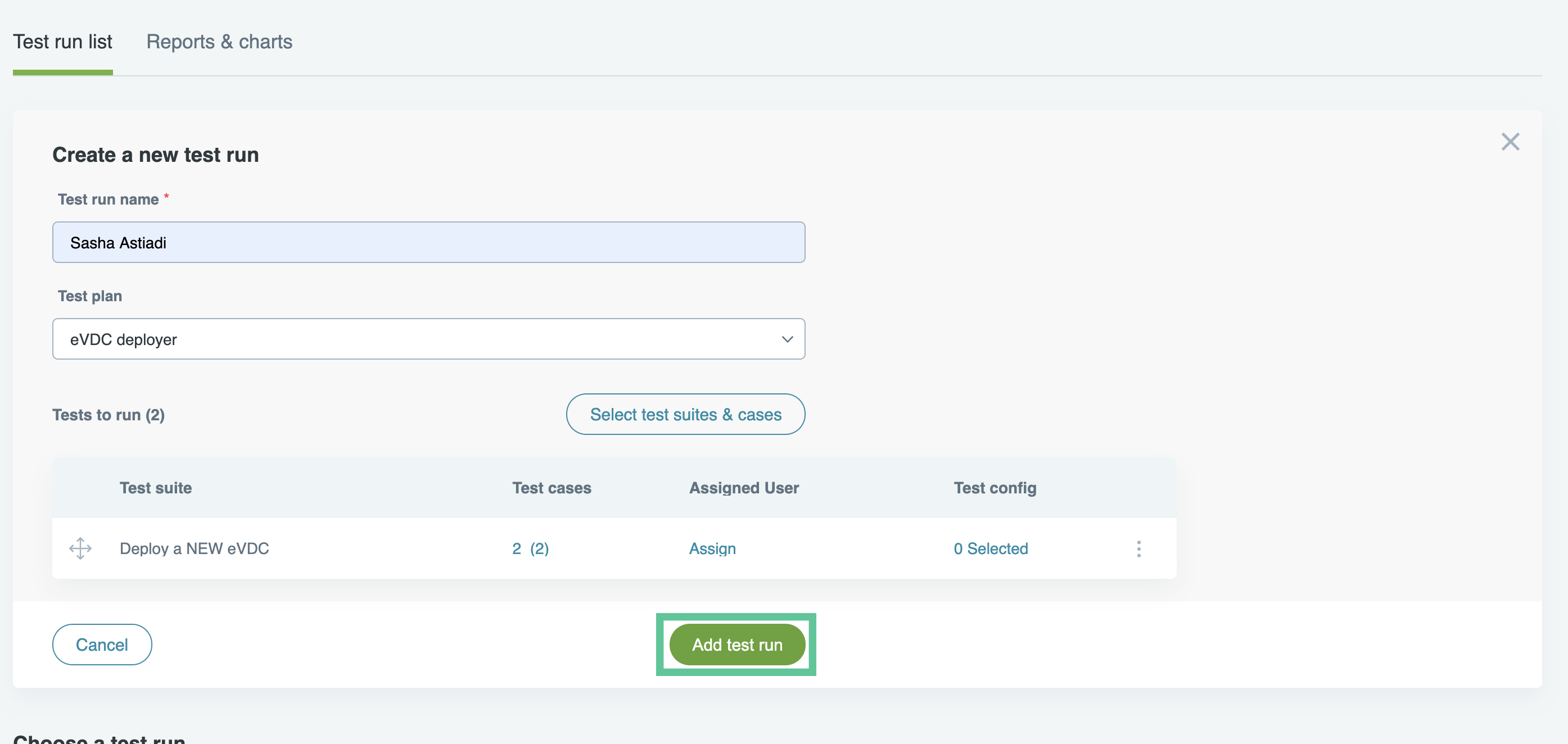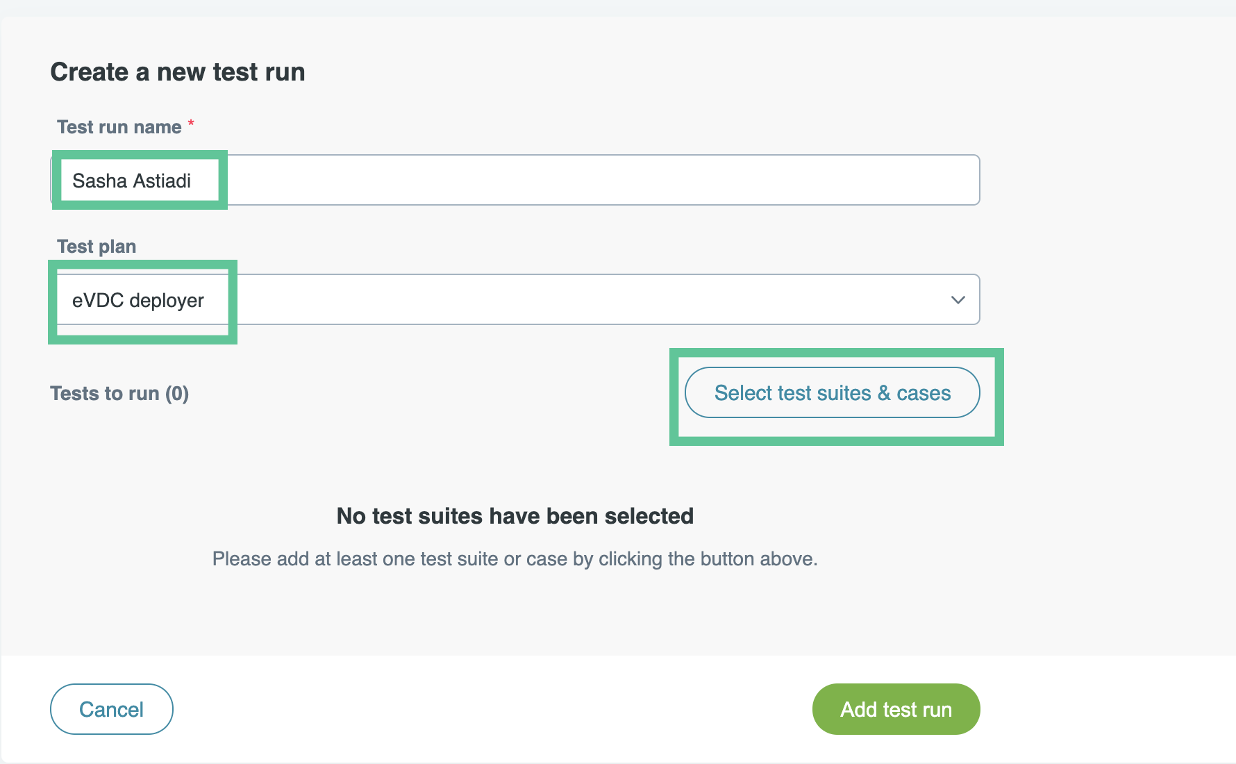 - Provide your name as the test name and select "eVDC Deployer" as your test suite since it is a test run for eVDC Deployer. Click on "Select Test Suites and Cases" to view the details of the use cases you want to test.