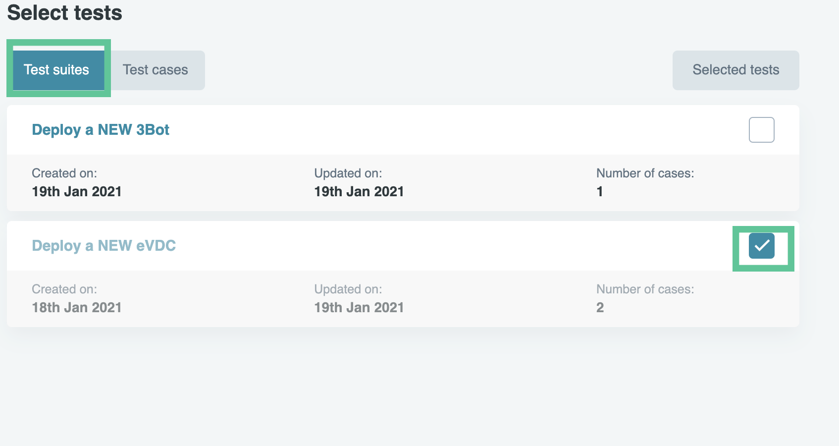 - On the "Select Test Suites and Cases" page, choose the "Deploy a new eVDC" test suite as your Test Suite. This suite includes the different use cases required to deploy an eVDC.