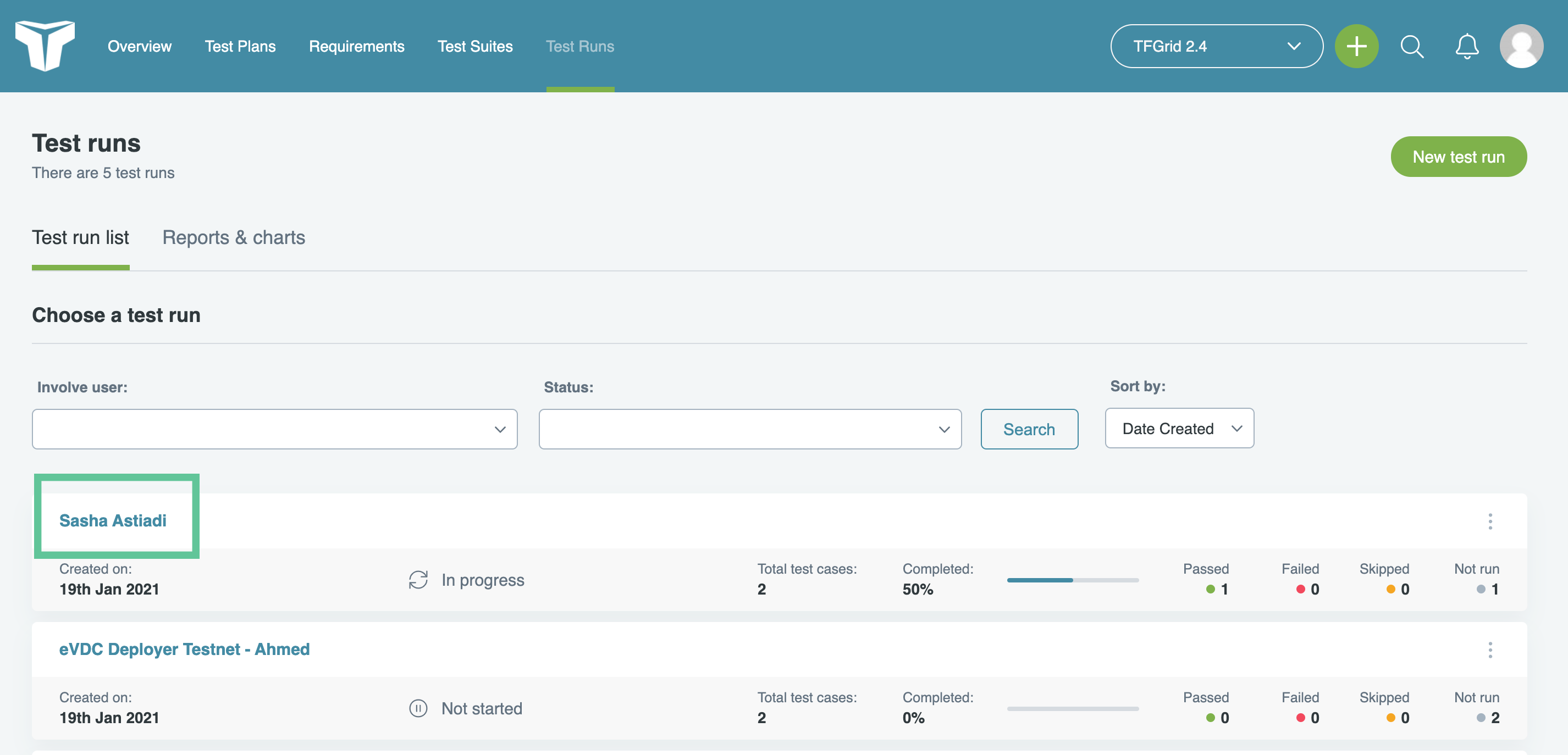 Total Test Runs: Reflects the total number of testing rounds conducted by users within the project. Each tester has their own Test Run, which serves as a testing dashboard for reporting test results. To get started with testing the TF Grid Test Suites, you need to create your own Test Run by using your name as the title.