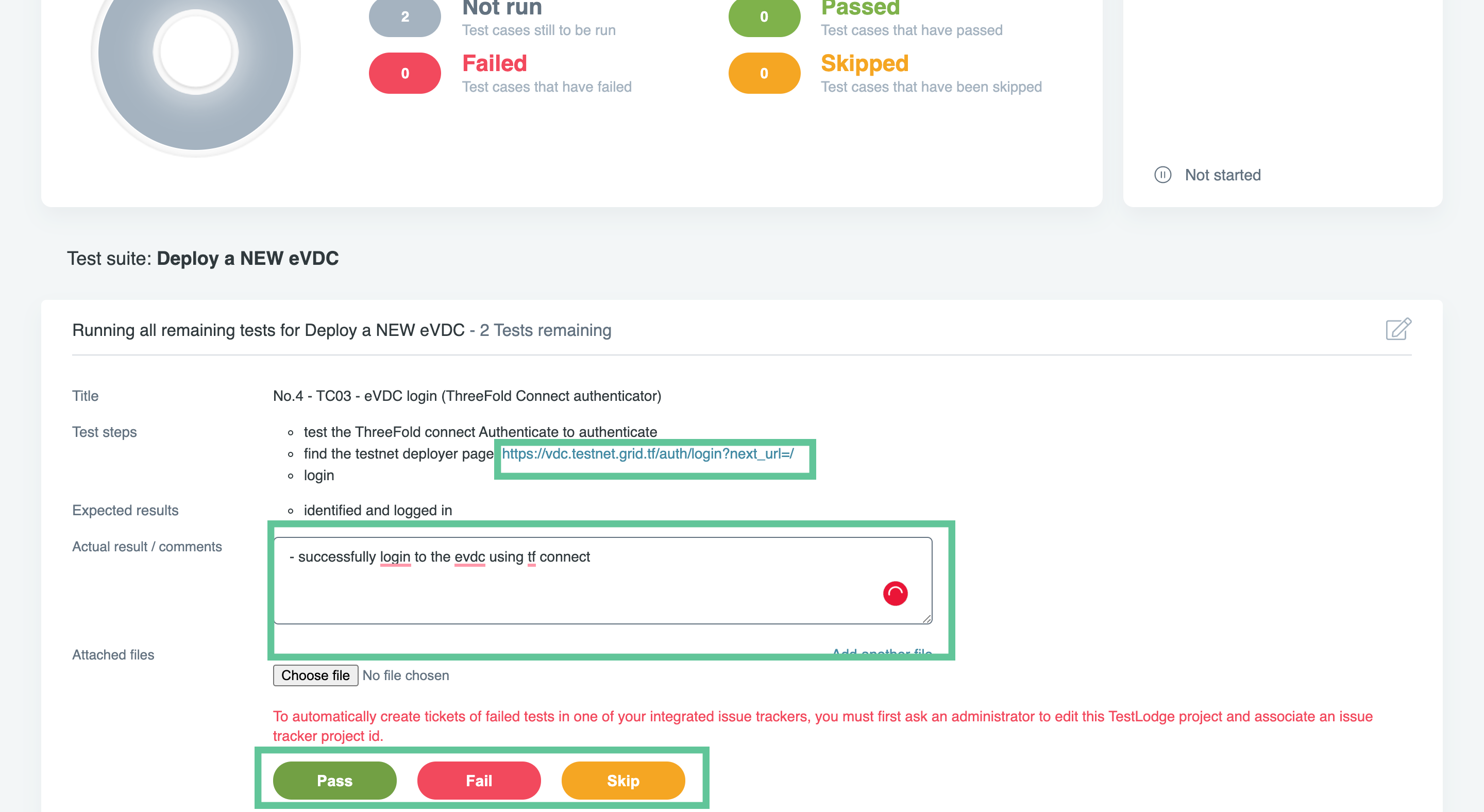 - Provide your remarks in the provided comment box and click "Pass," "Fail," or "Skip" based on the result of your test run to provide feedback to the ThreeFold QA Team.