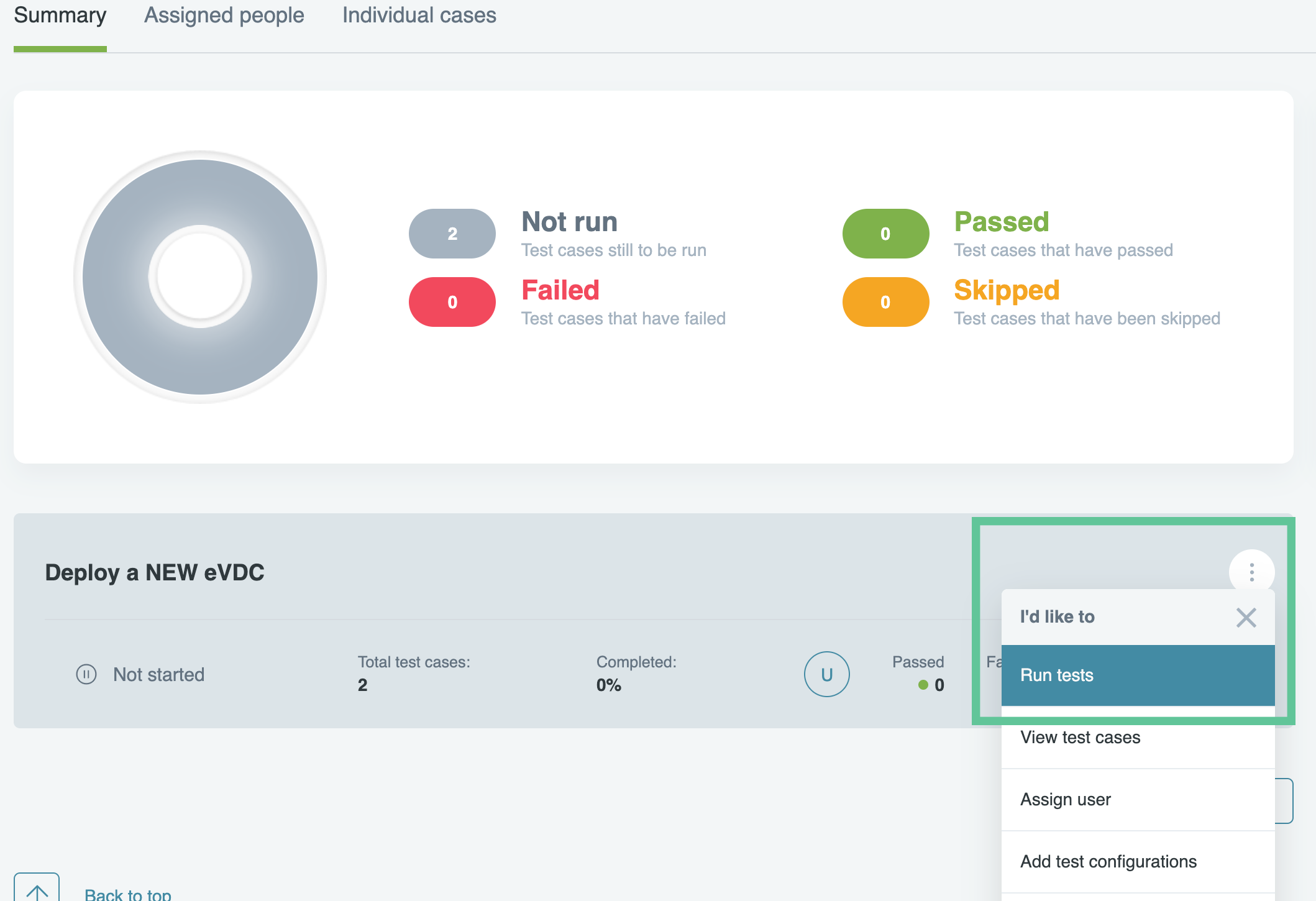 - In your test run profile, you will find a summary and a list of the test suites you need to run.