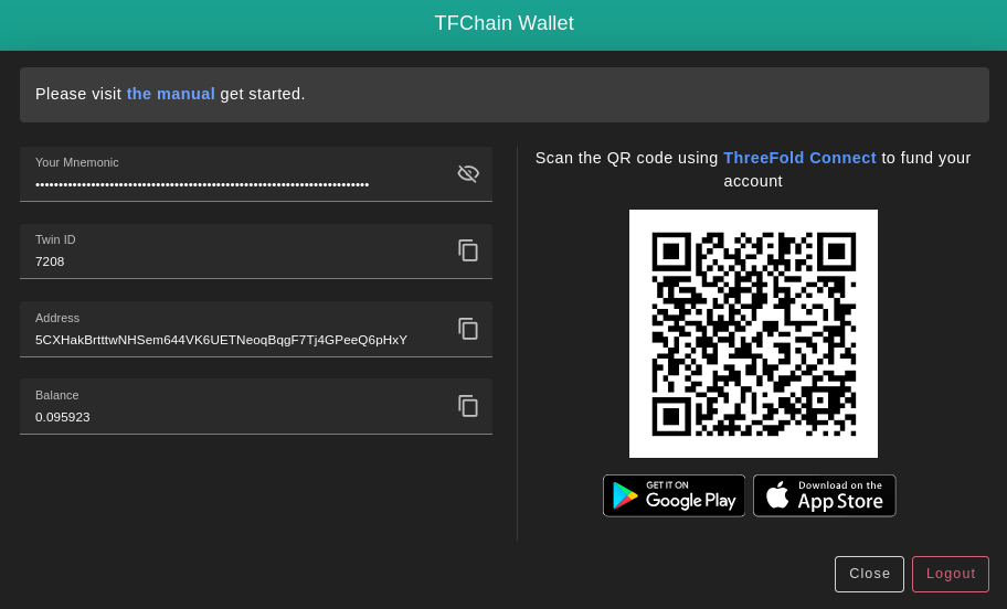 Upon activation, you will find your Twin ID, Address and wallet current balance generated under your Mnemonics.