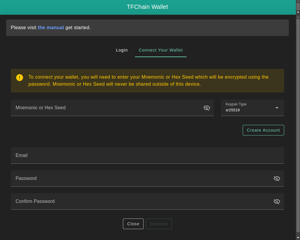 - To import a wallet or a farm created on the TF Connect app, use the TFChain HEX secret.