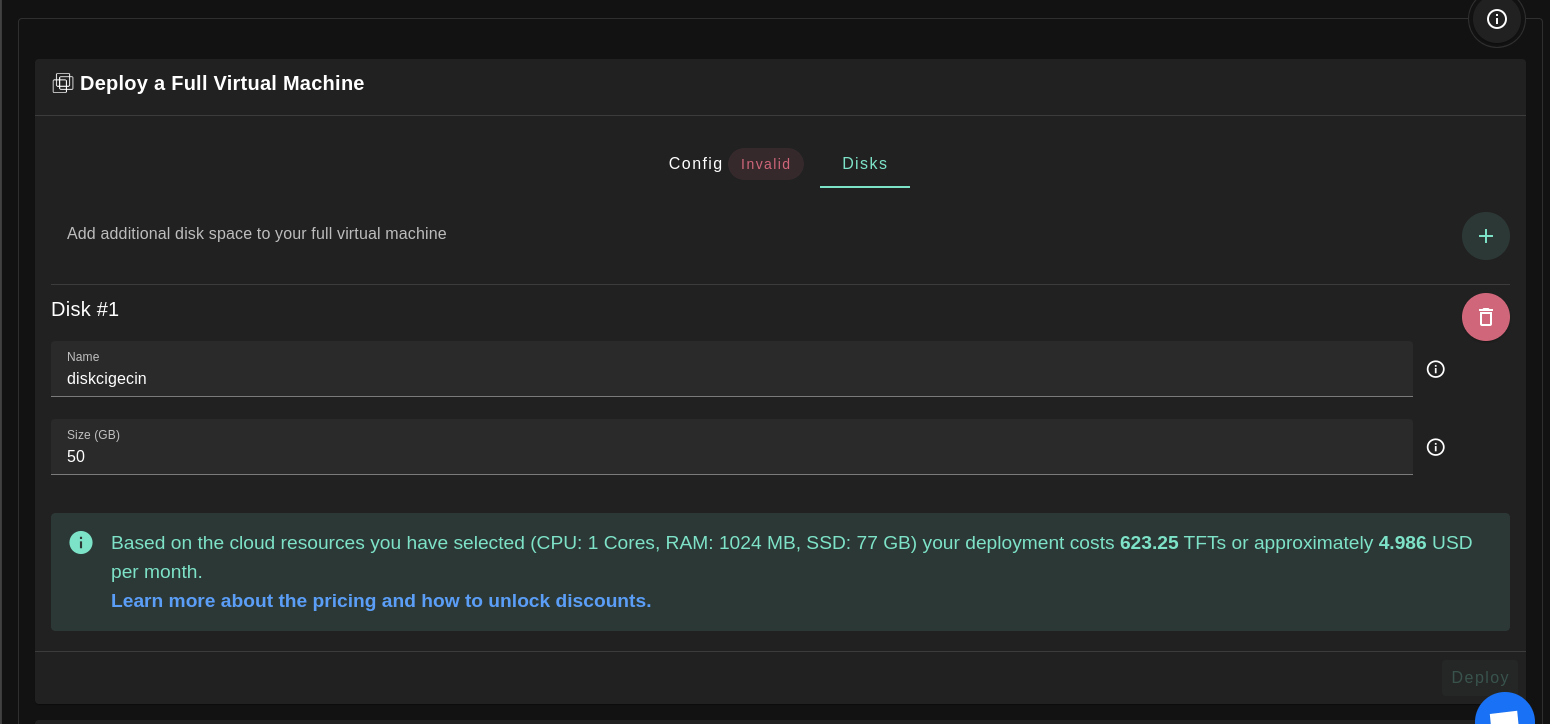 You can attach one or more disks to the Virtual Machine by clicking on the Disks tab and the plus + sign and specify the following parameters