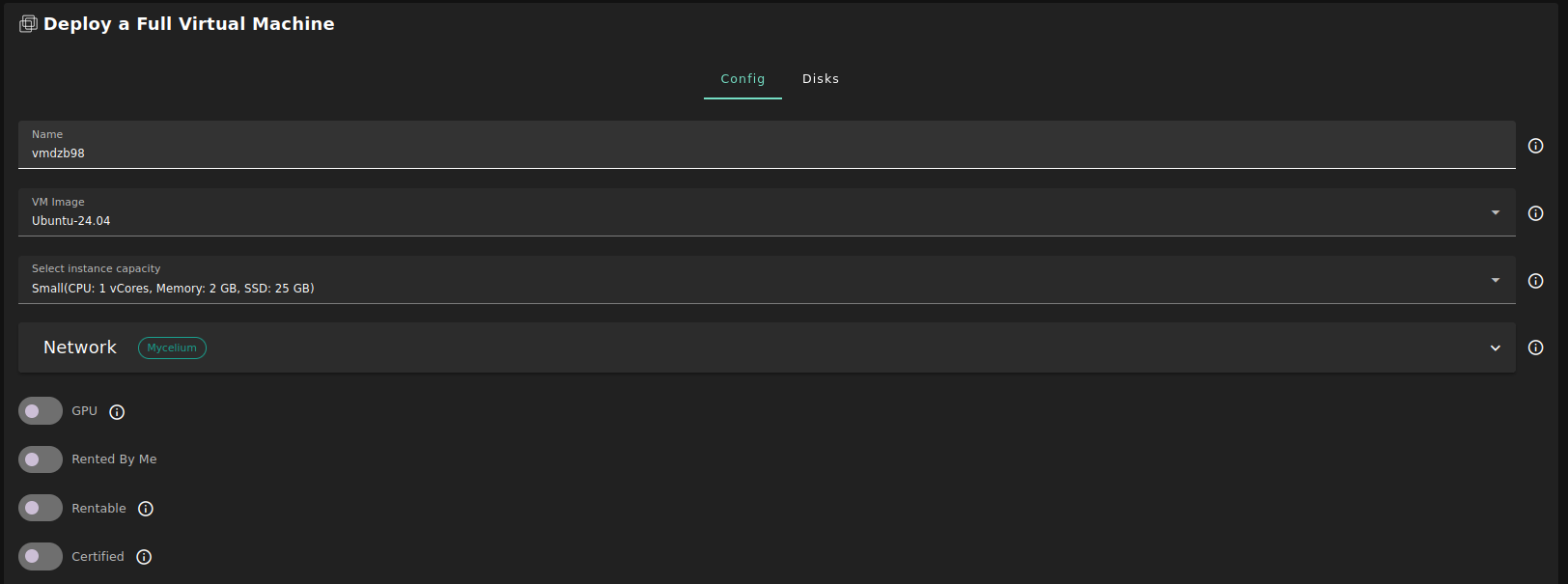 • Choose the image from the drop down (e.g Alpine, Ubuntu) or you can click on Other and manually specify the flist URL and the entrypoint.